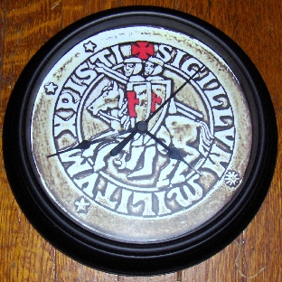 Our clock features the image of two Templars on a single horse. The text,